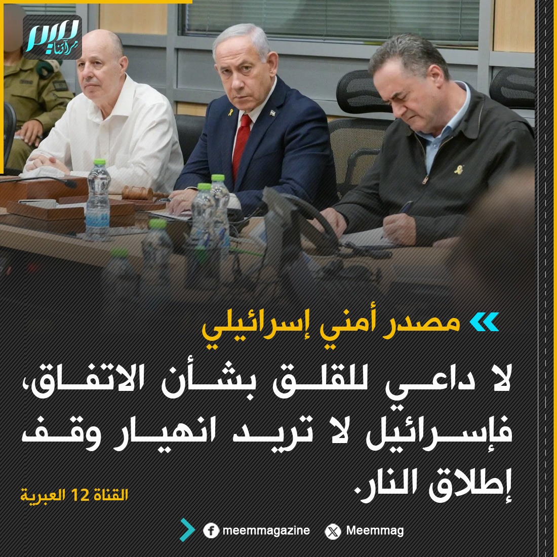مصدر أمني إسرائيلي للقناة 12 العبرية: لا داعي للقلق بشأن الاتفاق، فتل أبيب لا تريد انهيار وقف إطلاق النار.