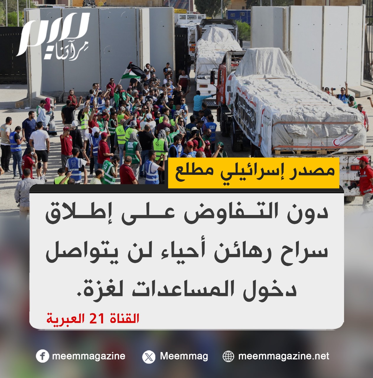 مصدر إسرائيلي مطلع: دون التفاوض على إطلاق سراح رهـ ـائن أحياء لن يتواصل دخول المساعدات لـغزة.