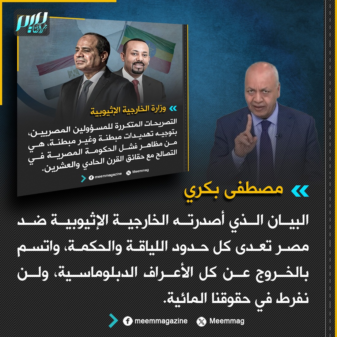 مصطفى بكري: البيان الذي أصدرته الخارجية الإثيوبية ضد مصر تعدى كل حدود اللياقة والحكمة، واتسم بالخروج عن كل الأعراف الدبلوماسية، ولن نفرط في حقوقنا المائية.