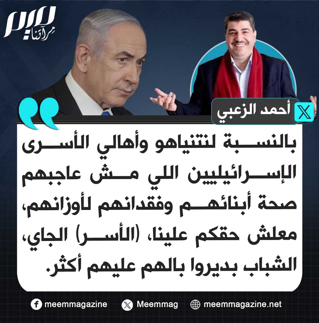 الزعبي: بالنسبة لنتنياهو وأهالي الأسرى الإسرائيليين اللي مش عاجبهم صحة أبنائهم وفقدانهم لأوزانهم، معلش حقكم علينا، (الأسر) الجاي، الشباب بديروا بالهم عليهم أكثر.
