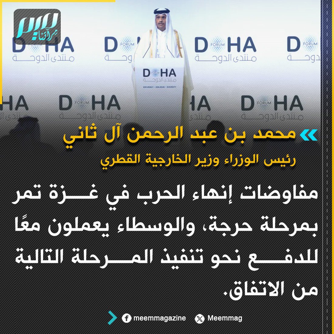 رئيس الوزراء وزير الخارجية القطري: مفاوضات إنهاء الحرب في غزة تمر بمرحلة حرجة، والوسطاء يعملون معًا للدفع نحو تنفيذ المرحلة التالية من الاتفاق.