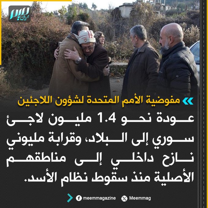 مفوضية الأمم المتحدة لشؤون اللاجئين: عودة نحو 1.4 مليون لاجئ سوري إلى البلاد، وقرابة مليوني نازح داخلي إلى مناطقهم الأصلية منذ سقوط نظام الأسد.