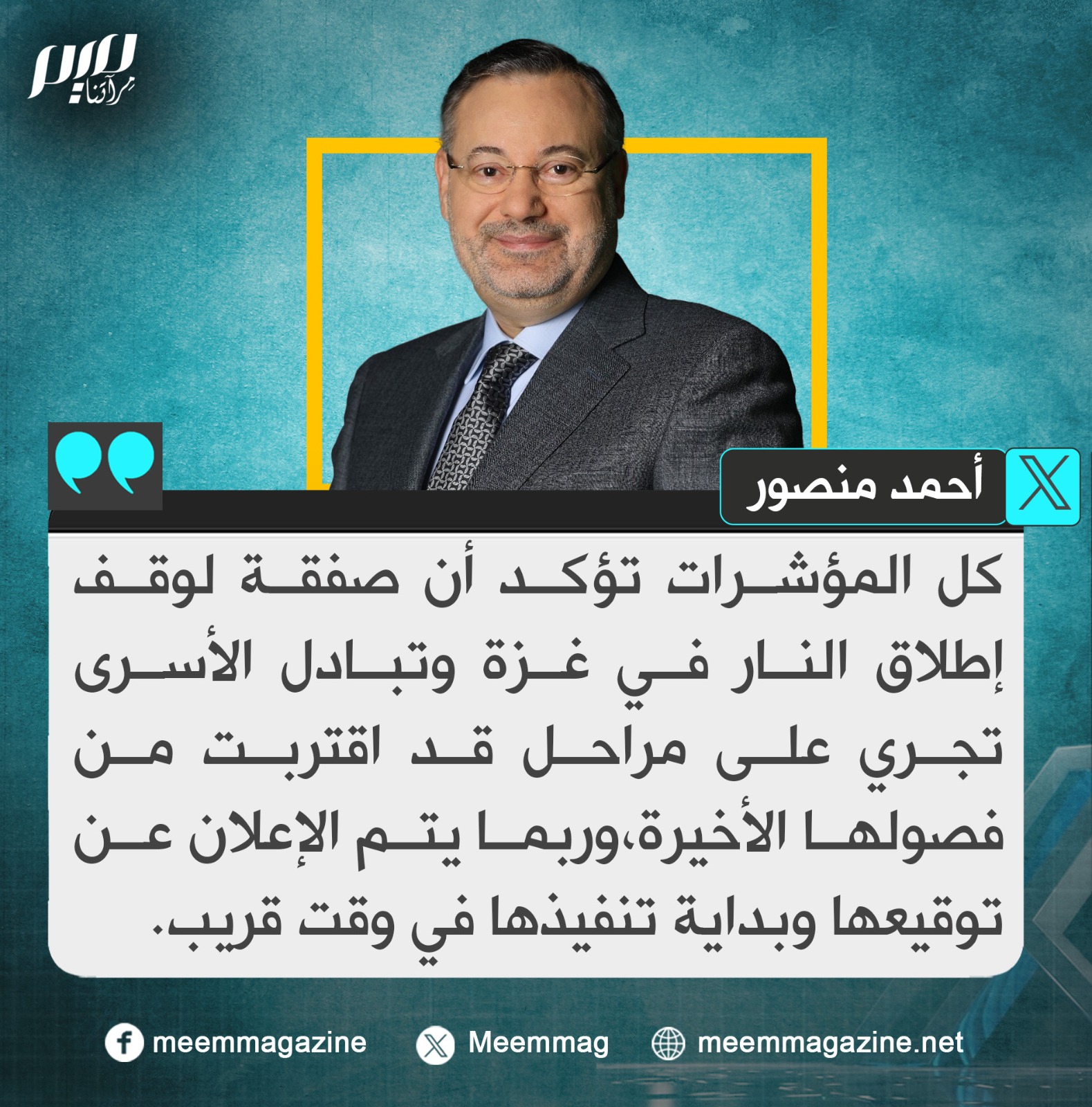 منصور: كل المؤشرات تؤكد أن صفقة لوقف إطلاق النار في غزة وتبادل الأسرى تجري على مراحل قد اقتربت من فصولها الأخيرة،وربما يتم الإعلان عن توقيعها وبداية تنفيذها في وقت قريب.