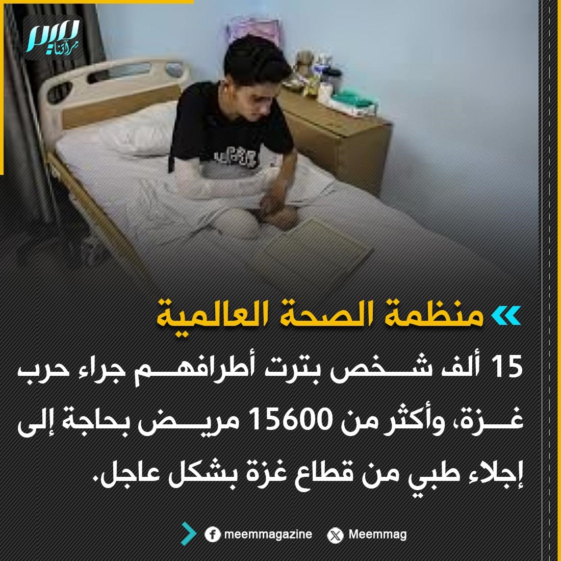 منظمة الصحة العالمية: 15 ألف شخص بترت أطرافهم جراء حرب غزة، وأكثر من 15600 مريض بحاجة إلى إجلاء طبي من قطاع غزة بشكل عاجل.