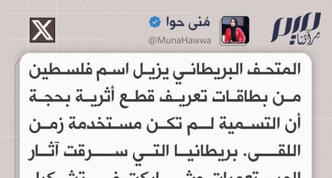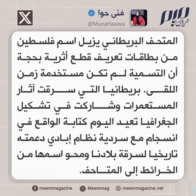منى حوا: بريطانيا التي سرقت آثار المستعمرات وشاركت في تشكيل الجغرافيا تُعيد اليوم كتابة الواقع في انسجام مع سردية نظام إبادي دعمته تاريخيا لسرقة بلادنا ومحو اسمها من الخرائط إلى المتاحف.