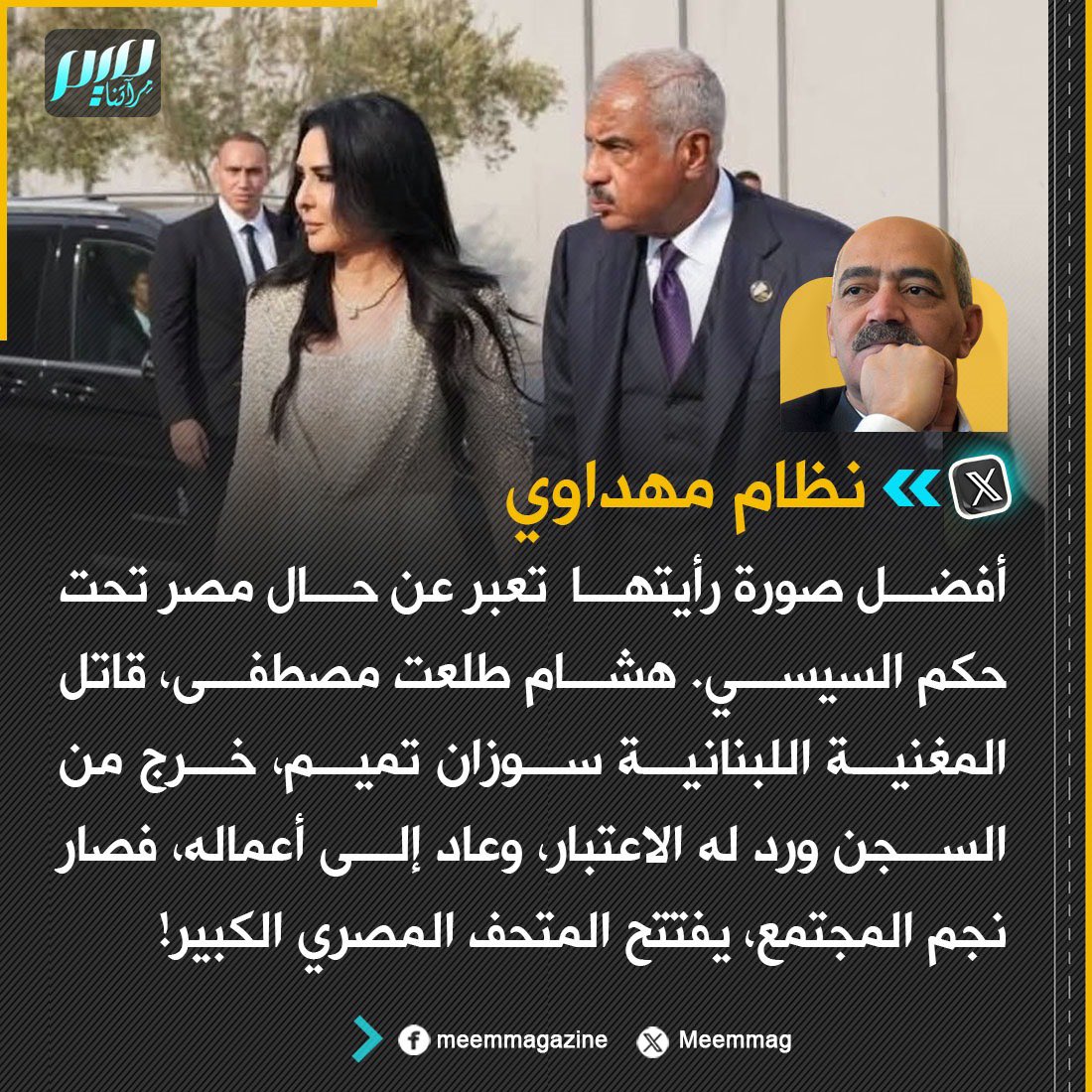 مهداوي: أفضل صورة رأيتها تعبر عن حال مصر تحت حكم السيسي. هشام طلعت مصطفى، قاتل المغنية اللبنانية سوزان تميم، خرج من السجن ورد له الاعتبار، وعاد إلى أعماله، فصار نجم المجتمع، يفتتح المتحف المصري الكبير!
