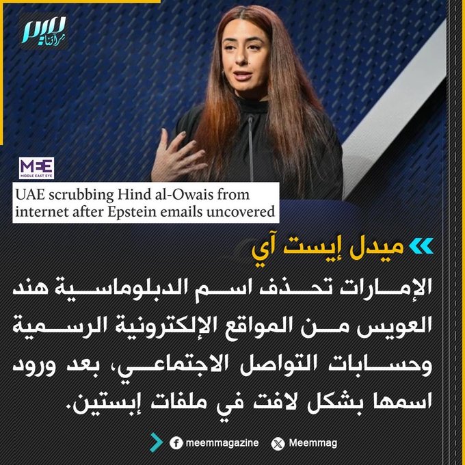 ميدل إيست آي: الإمارات تحذف اسم الدبلوماسية هند العويس من المواقع الإلكترونية الرسمية وحسابات التواصل الاجتماعي، بعد ورود اسمها بشكل لافت في ملفات إبستين.
