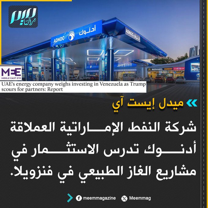 ميدل إيست آي: شركة النفط الإماراتية العملاقة أدنوك تدرس الاستثمار في مشاريع الغاز الطبيعي في فنزويلا.