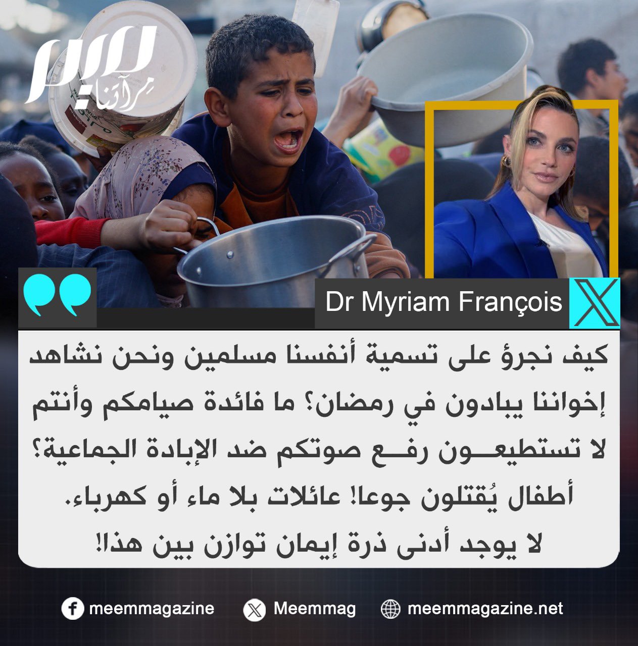 المخرجة والصحفية البريطانية ميريام فرنسوا: كيف نجرؤ على تسمية أنفسنا مسلمين ونحن نشاهد إخواننا يبادون في رمضان؟!
