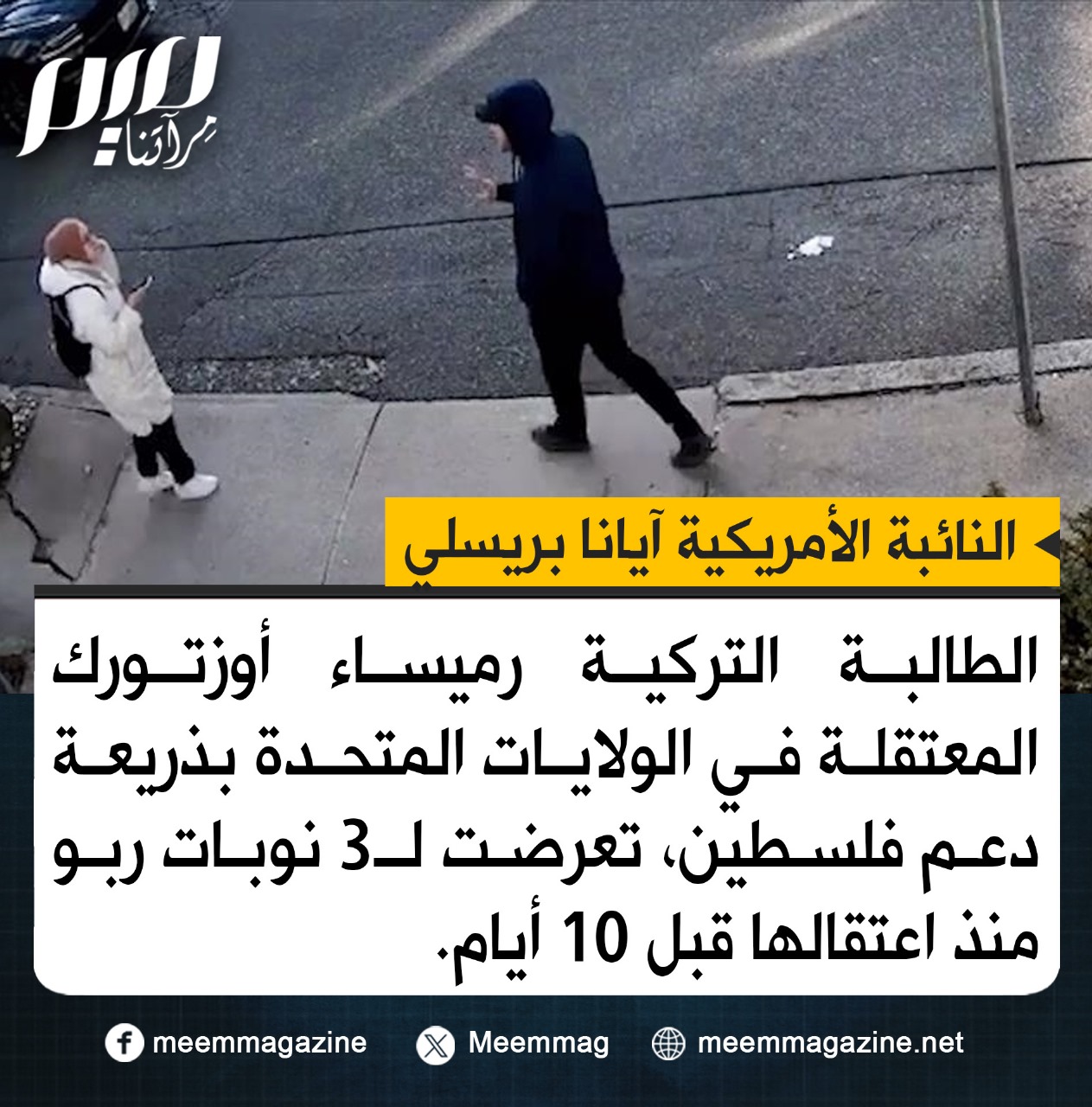 نائبة أمريكية: الطالبة التركية رميساء أوزتورك المعتقلة في الولايات المتحدة بذريعة دعم فلسطين، تعرضت لـ 3 نوبات ربو منذ اعتقالها قبل 10 أيام.