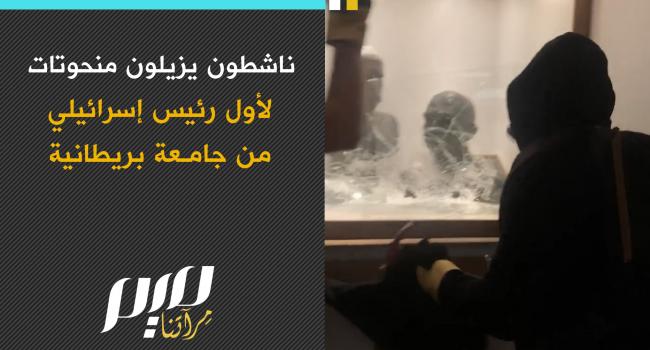 ناشطون من حركة "بال أكشن" يزيلون منحوتات لأول رئيس في تاريخ "إسرائيل" حاييم وايزمان، الذي كان له دور بارز في استصدار وعد بلفور قبل 107 أعوام، من حرم جامعة مانشستر في بريطانيا.