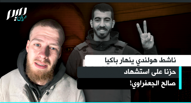 في مقطع مؤثر، الناشط الهولندي براين بورياس ينهار باكيا حزنا على استشهاد الصحفي الفلسطيني صالح الجعفراوي: "كيف نسمح بحدوث هذا مرارا وتكرارا؟ أين الإنسانية والرحمة؟ نعم، أنا رجل بالغ يذرف الدموع بسبب مقتل رجل بالغ آخر لأنني إنسان."