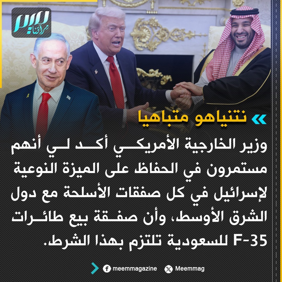 نتنياهو متباهيا: ماركو روبيو أكد لي استمرار الولايات المتحدة في الحفاظ على تفوق إسرائيل العسكري، وصفقة F-35 للسعودية تلتزم بذلك.