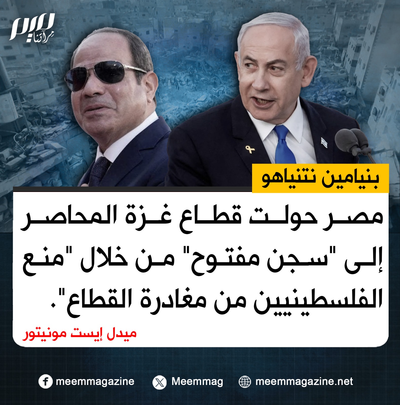 نتنياهو: مصر حولت قطاع غزة المحاصر إلى "سجن مفتوح" من خلال "منع الفلسطينيين من مغادرة القطاع".
