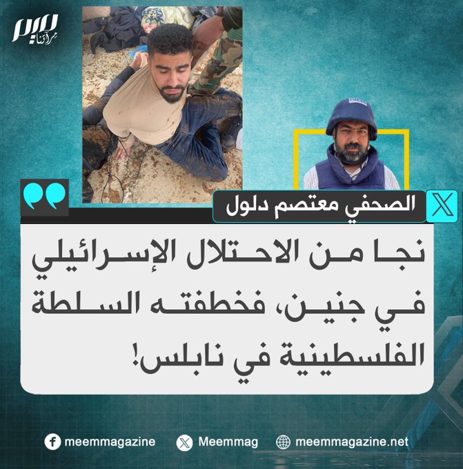 دلول يعلق على صورة مقاوم اعتقل اليوم بقوله: نجا من الاحتلال الإسرائيلي في جنين، فخطفته السلطة الفلسطينية في نابلس!