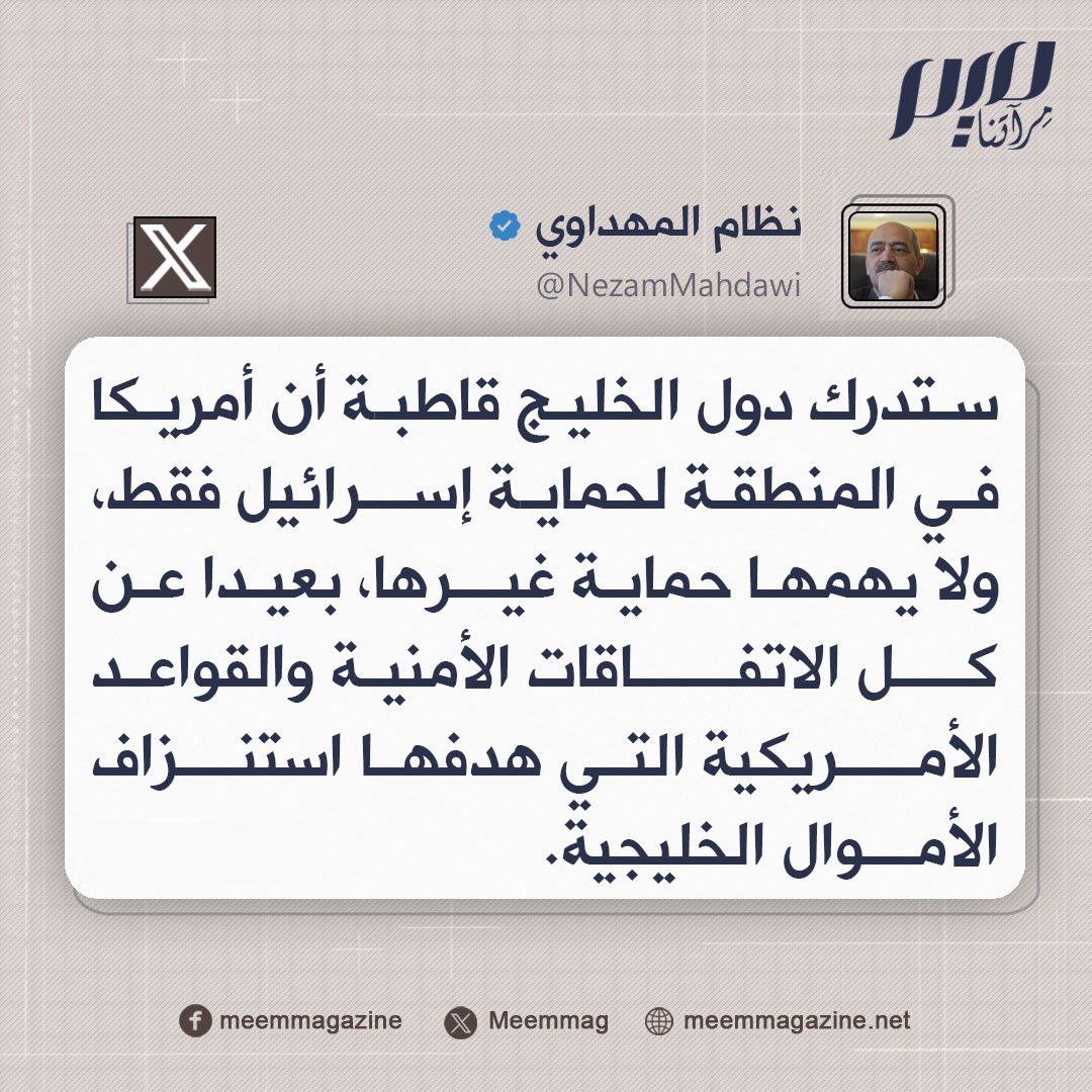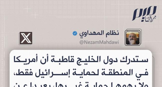 نظام المهداوي: ستدرك دول الخليج قاطبة أن أمريكا في المنطقة لحماية إسرائيل فقط، ولا يهمها حماية غيرها، بعيدا عن كل الاتفاقات الأمنية والقواعد الأمريكية التي هدفها استنزاف الأموال الخليجية.