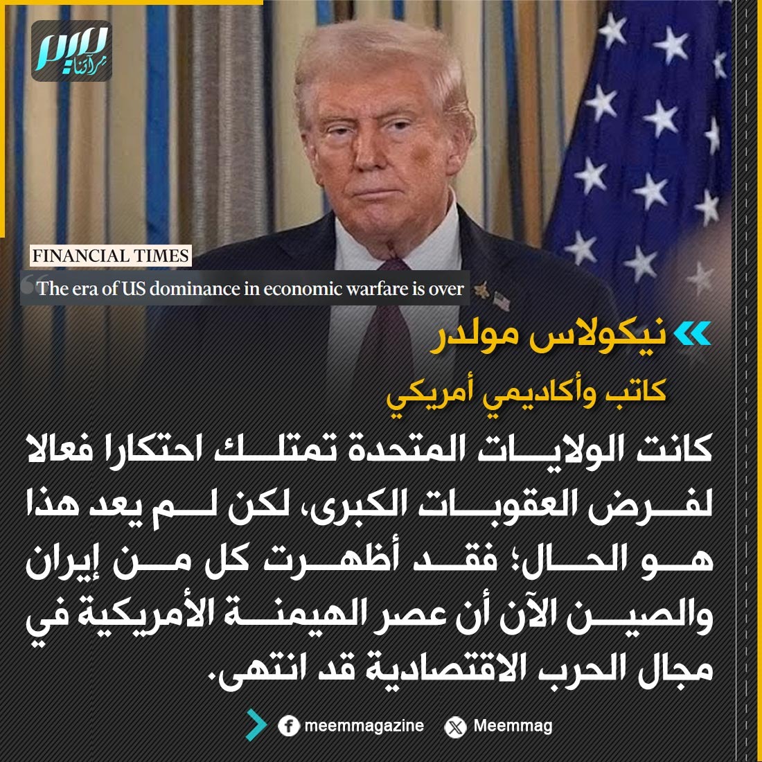 نيكولاس مولدر: أظهرت كل من إيران والصين أن عصر الهيمنة الأمريكية في مجال الحرب الاقتصادية قد انتهى.
