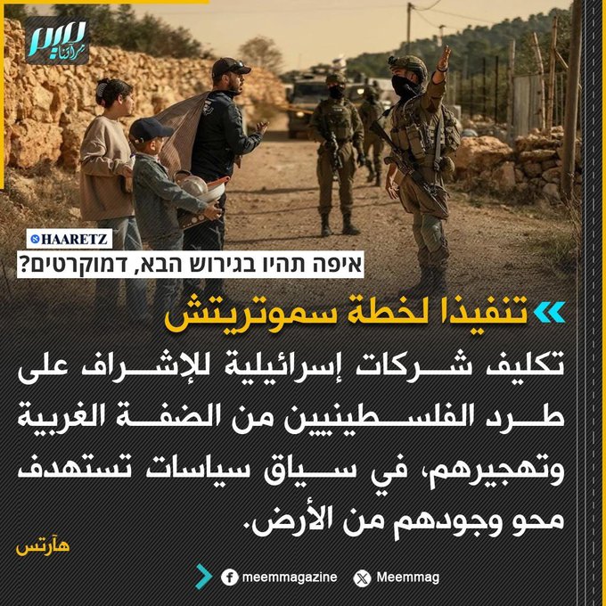 هآرتس: تكليف شركات إسرائيلية للإشراف على طرد الفلسطينيين من الضفة الغربية وتهجيرهم ومحو وجودهم من الأرض.