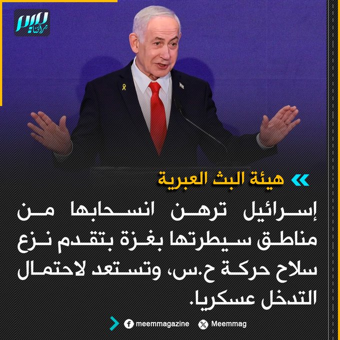 هيئة البث العبرية: إسرائيل ترهن انسحابها من مناطق سيطرتها بغزة بتقدم نزع سلاح حركة ح.س، وتستعد لاحتمال التدخل عسكريا.