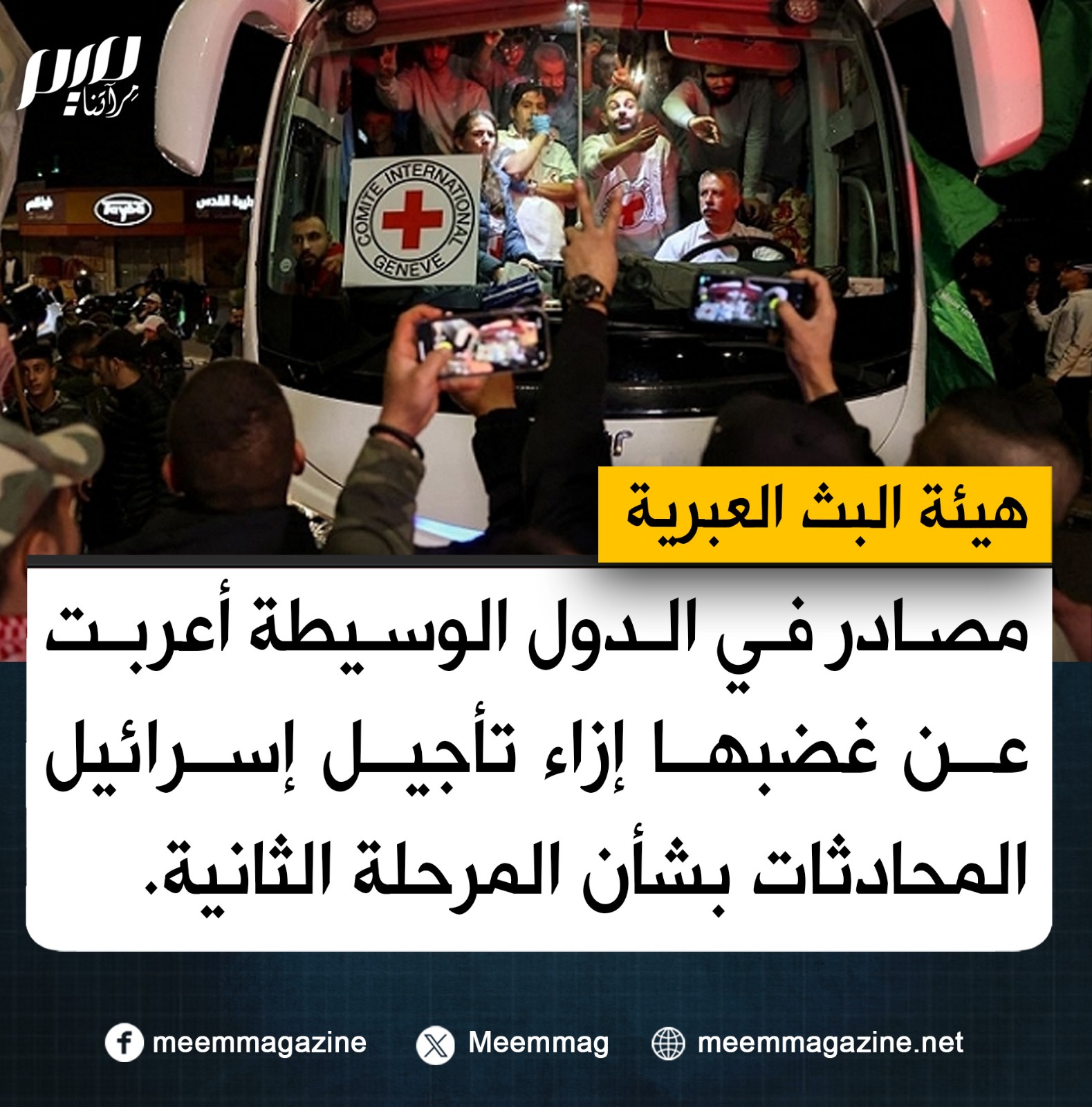 هيئة البث العبرية: مصادر في الدول الوسيطة أعربت عن غضبها إزاء تأجيل إسرائيل المحادثات بشأن المرحلة الثانية.