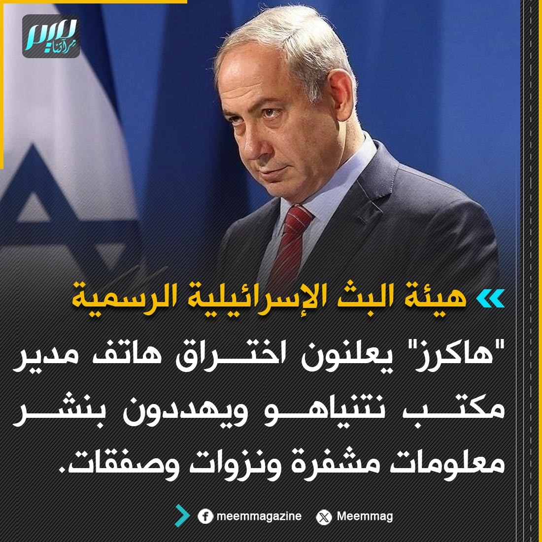 هيئة البث العبرية: "هاكرز" يعلنون اختراق هاتف مدير مكتب نتنياهو ويهددون بنشر معلومات مشفرة ونزوات وصفقات، والمجموعة إيرانية وتسمى "حنظلة" وسبق أن اخترقت حساب رئيس وزراء إسرائيل السابق نفتالي بينيت على "تلغرام".