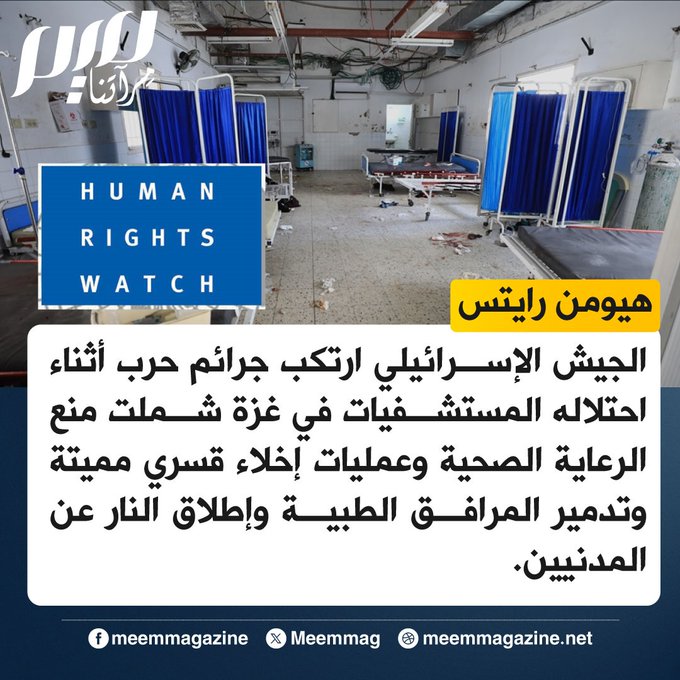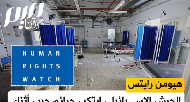 هيومن رايتس: الجيش الإسرائيلي ارتكب جرائم حرب أثناء احتلاله المستشفيات في غزة شملت منع الرعاية الصحية وعمليات إخلاء قسري مميتة وتدمير المرافق الطبية وإطلاق النار عن المدنيين.
