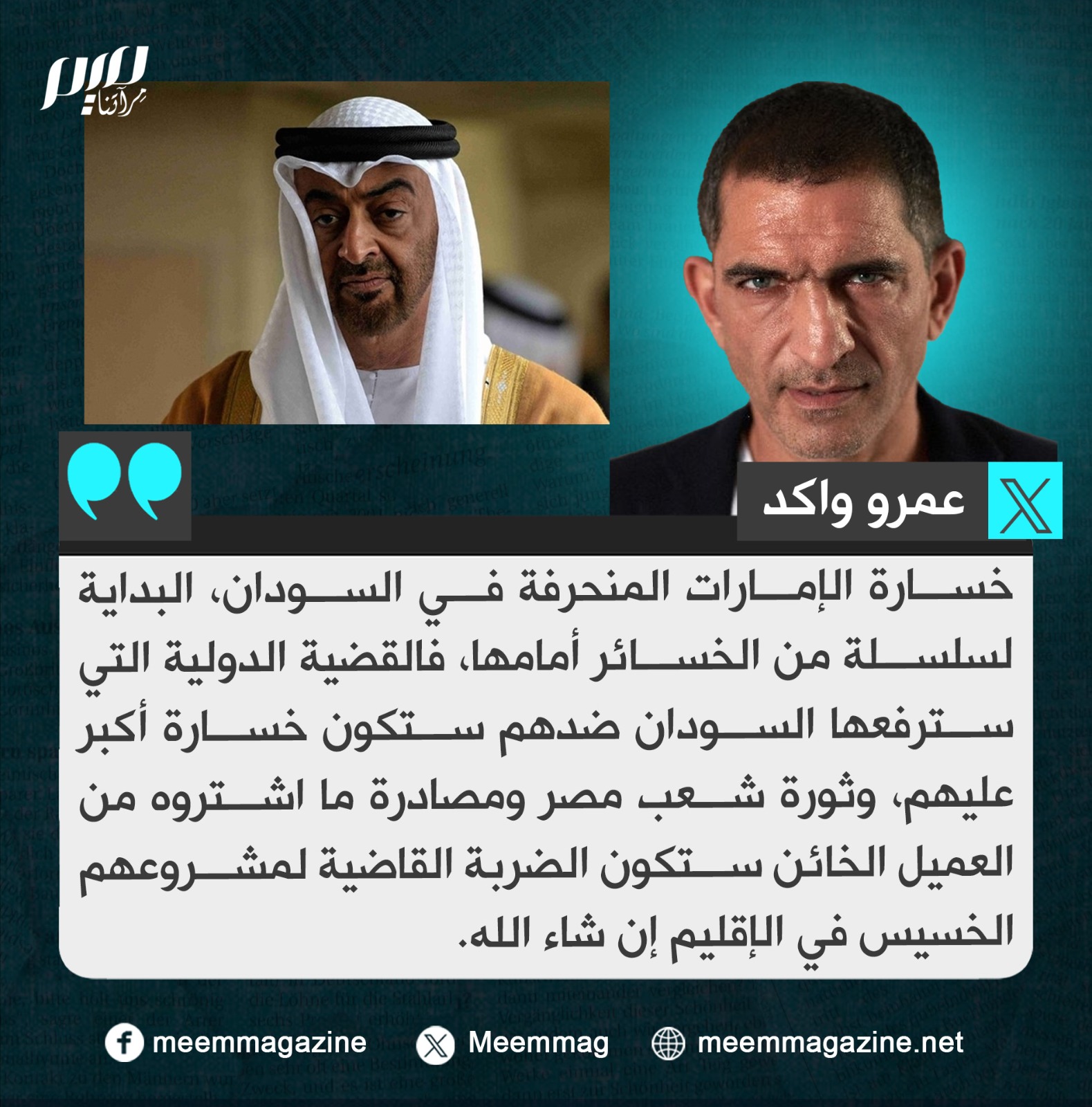 واكد: خسارة الإمارات المنحرفة في السودان، البداية لسلسلة من الخسائر أمامها، فالقضية الدولية التي سترفعها السودان ضدهم ستكون خسارة أكبر عليهم، وثورة شعب مصر ومصادرة ما اشتروه من العميل الخائن ستكون الضربة القاضية لمشروعهم الخسيس في الإقليم إن شاء الله.