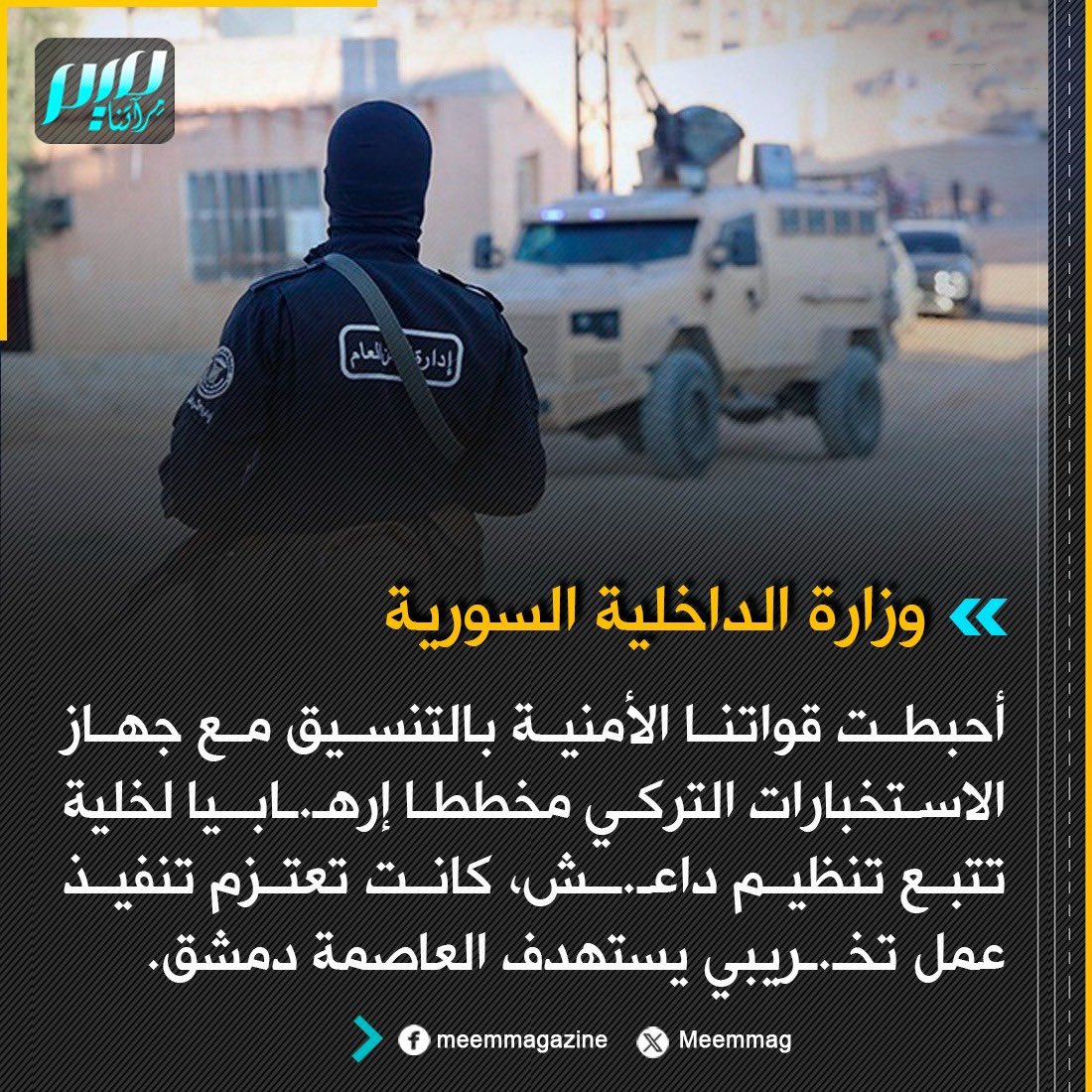 وزارة الداخلية السورية: أحبطت قواتنا الأمنية بالتنسيق مع جهاز الاستخبارات التركي مخططا إرهـ.ـابـيا لخلية تتبع تنظيم داعـ.ـش، كانت تعتزم تنفيذ عمل تخـ.ـريبي يستهدف العاصمة دمشق.