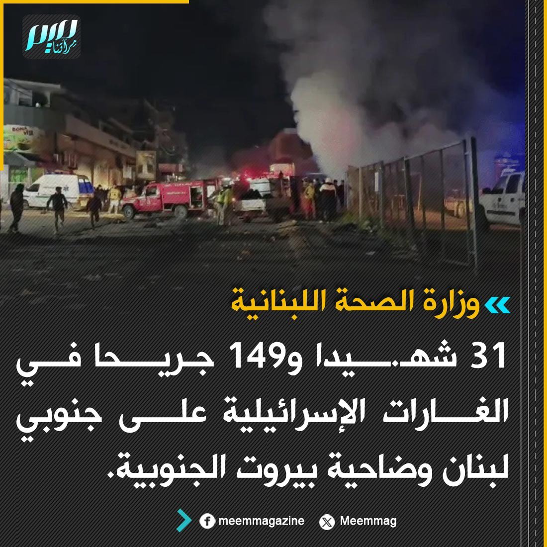 وزارة الصحة اللبنانية: 31 شهـ.ـيدا و149 جريحا في الغارات الإسرائيلية على جنوبي لبنان وضاحية بيروت الجنوبية.