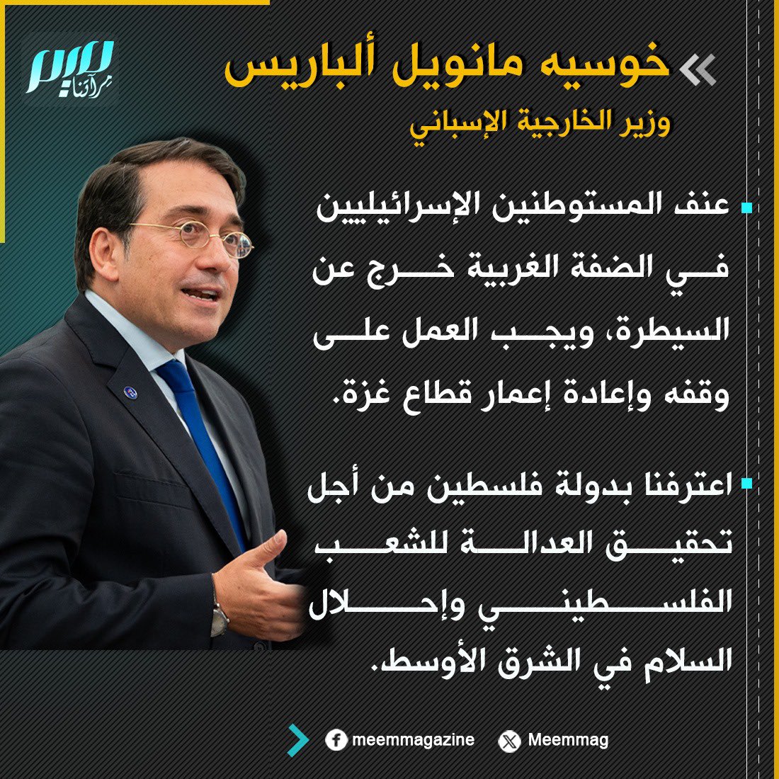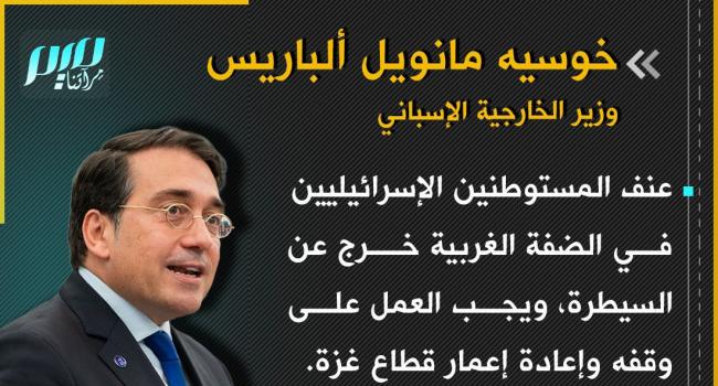 وزير الخارجية الإسباني: عنف المستوطنين الإسرائيليين في الضفة الغربية خرج عن السيطرة، ويجب العمل على وقفه وإعادة إعمار قطاع غزة.