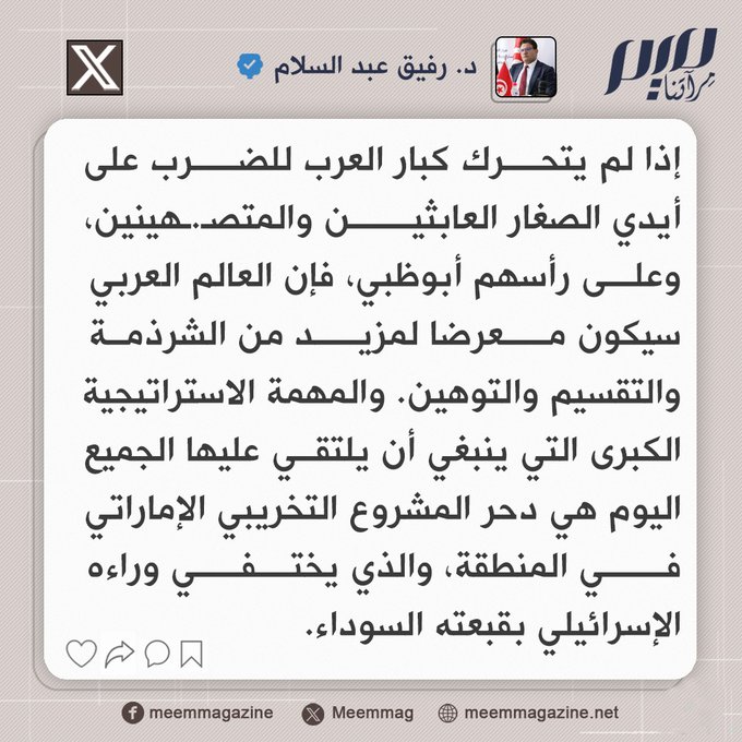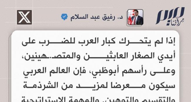 وزير خارجية تونس الأسبق: إذا لم يتحرك كبار العرب للضرب على أيدي الصغار العابثين والمتصـ.ـهينين، وعلى رأسهم أبوظبي، فإن العالم العربي سيكون معرضا لمزيد من الشرذمة والتقسيم والتوهين.