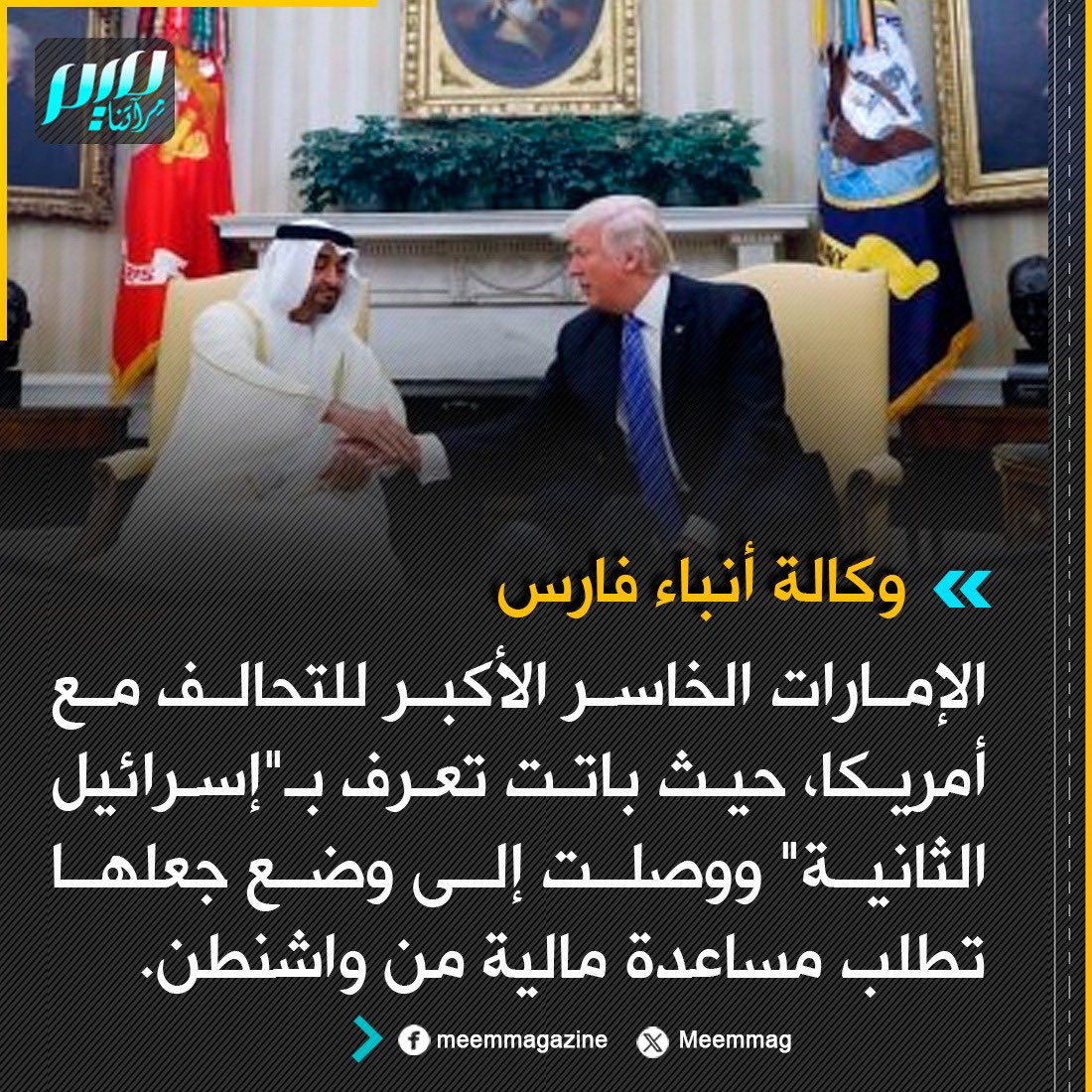 وكالة أنباء فارس: الإمارات الخاسر الأكبر للتحالف مع أمريكا، حيث باتت تعرف بـ"إسرائيل الثانية" ووصلت إلى وضع جعلها تطلب مساعدة مالية من واشنطن.