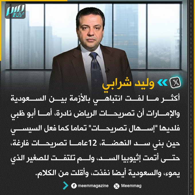 وليد شرابي: أكثر ما لفت انتباهي بالأزمة بين السعودية والإمارات أن تصريحات الرياض نادرة، أما أبو ظبي فلديها "إسهال تصريحات" تماما كما فعل السيسي حين بني سد النهضة، ١٢عاما تصريحات فارغة، حتى أتمت إثيوبيا السد، ولم تلتفت للصغير الذي يموء، والسعودية أيضا نفذت، وأقلت من الكلام.