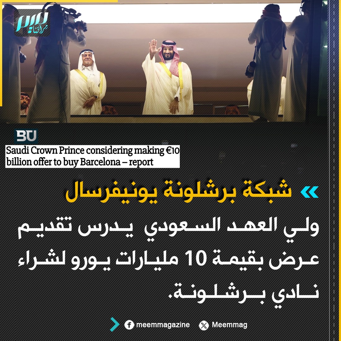 شبكة برشلونة يونيفرسال الرياضية: ولي العهد السعودي محمد بن سلمان يدرس تقديم عرض بقيمة 10 مليارات يورو لشراء نادي برشلونة.