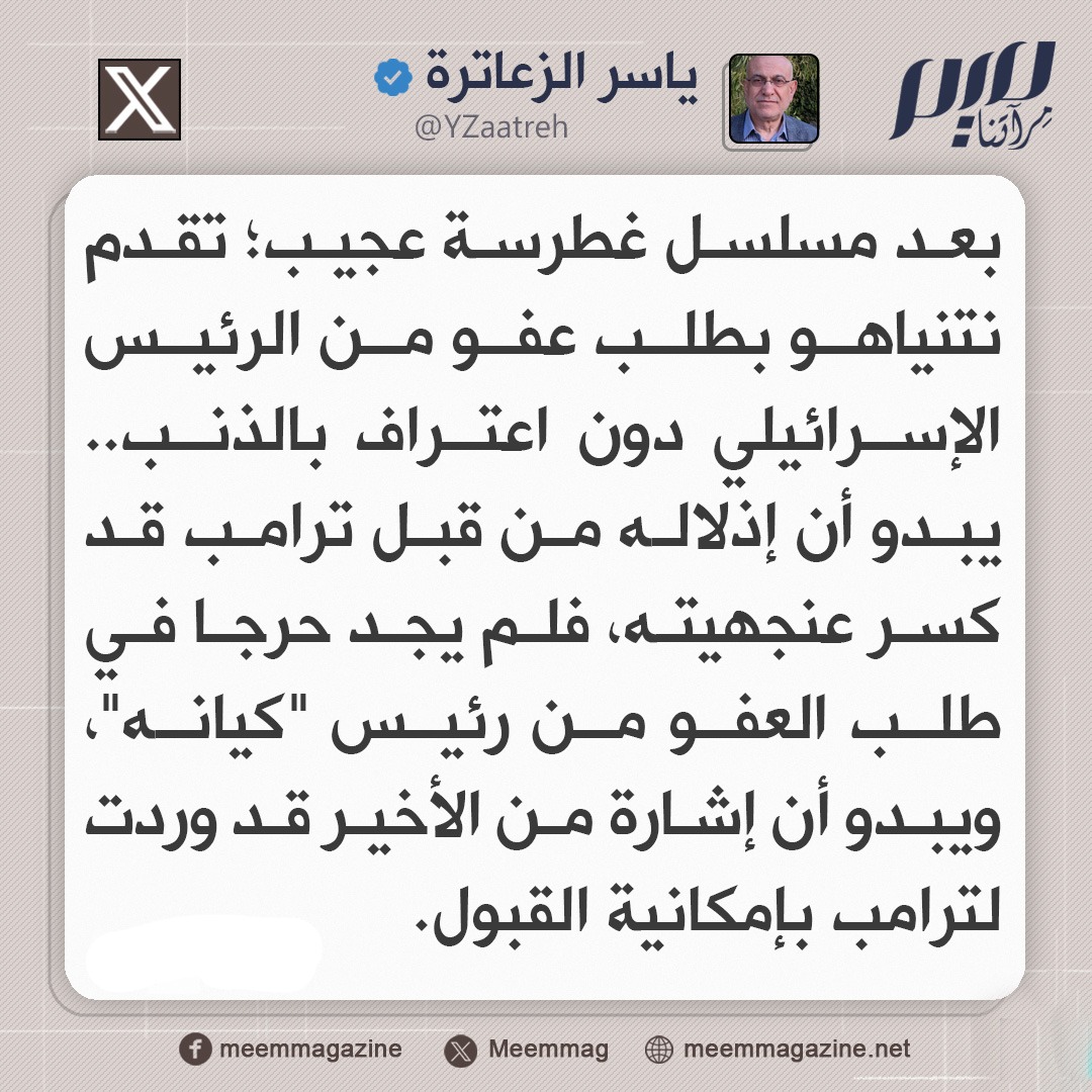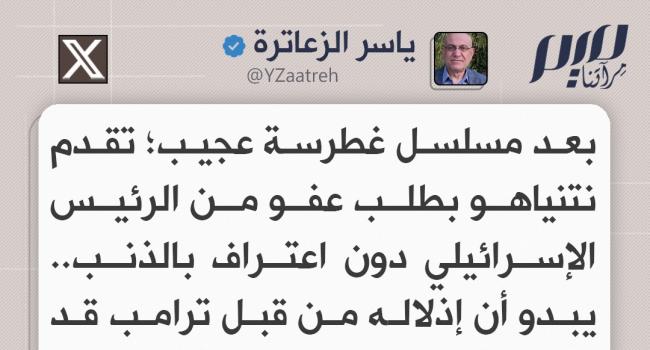ياسر الزعاترة: بعد مسلسل غطرسة عجيب؛ تقدم نتنياهو بطلب عفو من الرئيس الإسرائيلي دون اعتراف بالذنب.. يبدو أن إذلاله من قبل ترامب قد كسر عنجهيته، فلم يجد حرجا في طلب العفو من رئيس "كيانه"، ويبدو أن إشارة من الأخير قد وردت لترامب بإمكانية القبول.