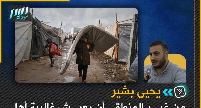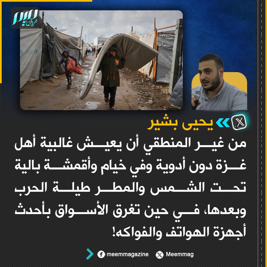 يحيى بشير: من غير المنطقي أن يعيش غالبية أهل غزة دون أدوية وفي خيام وأقمشة بالية تحت الشمس والمطر طيلة الحرب وبعدها، في حين تغرق الأسواق بأحدث أجهزة الهواتف والفواكه!