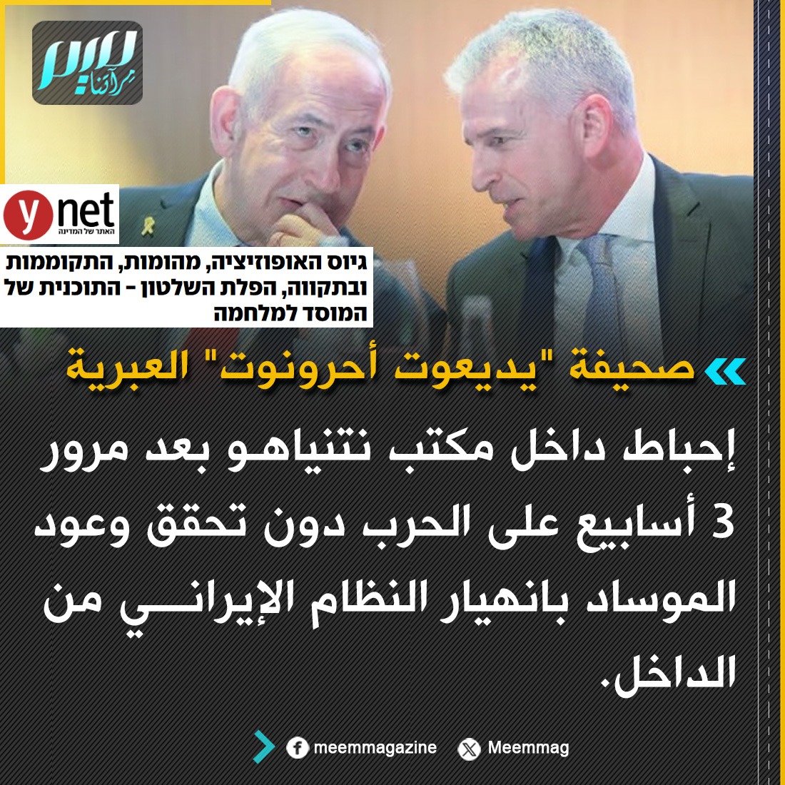 يديعوت أحرونوت: إحباط داخل مكتب نتنياهو بعد مرور 3 أسابيع على الحرب دون تحقق وعود الموساد بانهيار النظام الإيراني من الداخل.