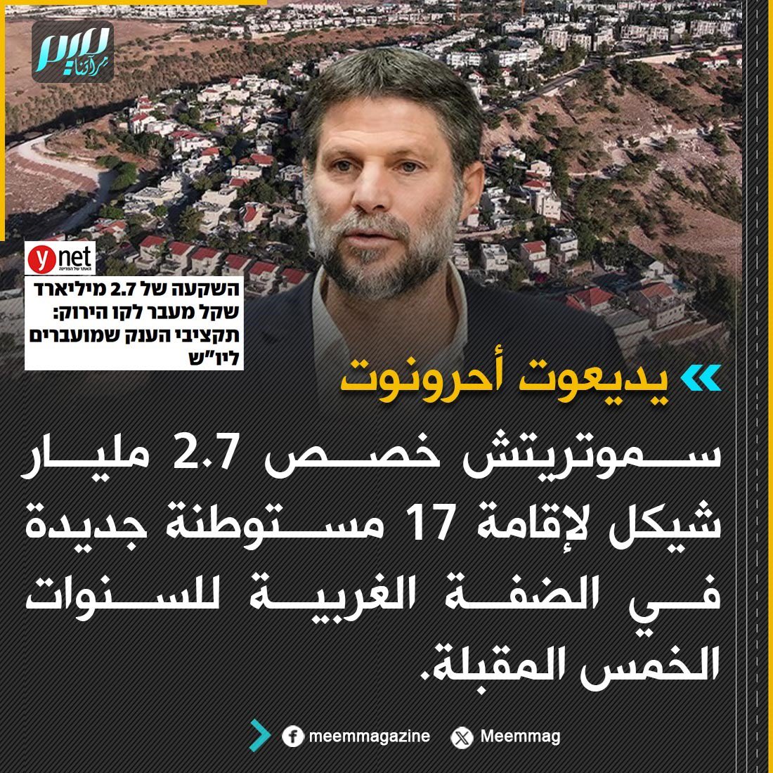 يديعوت أحرونوت: سموتريتش خصص 2.7 مليار شيكل لإقامة 17 مستوطنة جديدة في الضفة الغربية للسنوات الخمس المقبلة.