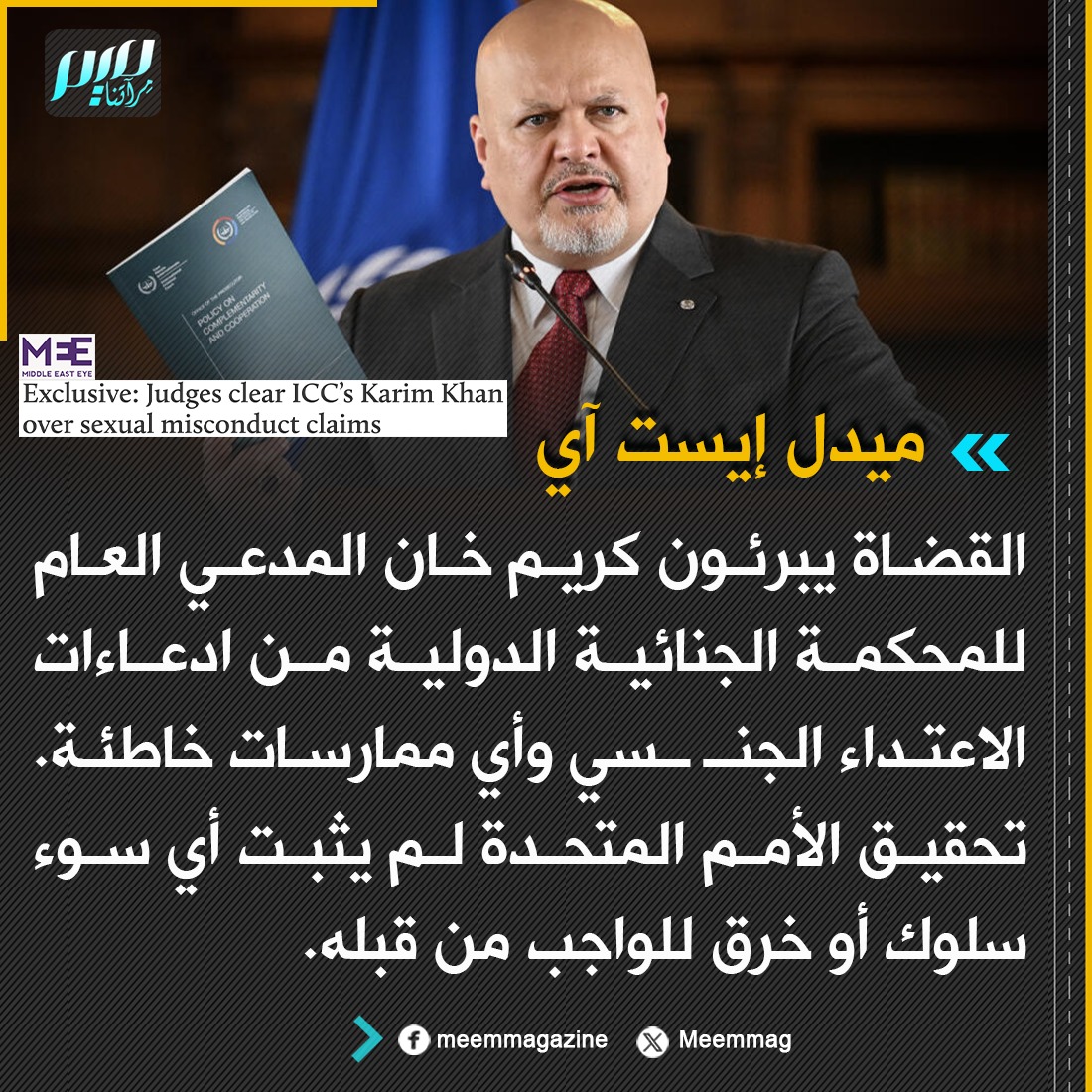 يذكر أن المزاعم ضد كريم خان كانت قد ظهرت إثر جهوده المكثفة لإدانة مسؤولي إسرائيل