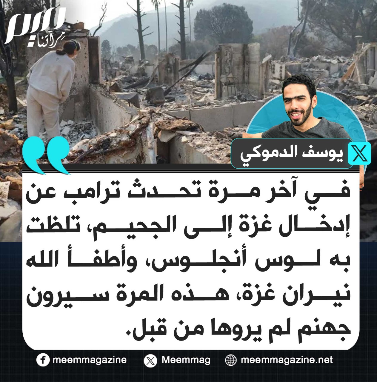 يوسف الدموكي: في آخر مرة تحدث ترامب عن إدخال غزة إلى الجحيم، تلظت به لوس أنجلوس، وأطفأ الله نيران غزة، هذه المرة سيرون جهنم لم يروها من قبل.