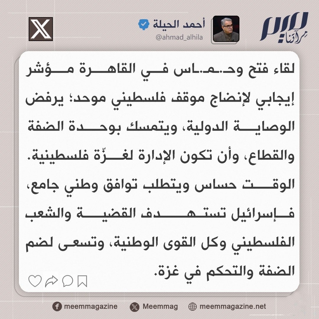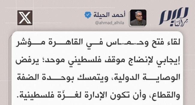 أحمد الحيلة: لقاء فتح وحـ.ـمـ.ـاس في القاهرة مؤشر إيجابي لإنضاج موقف فلسطيني موحد؛ يرفض الوصاية الدولية، ويتمسك بوحدة الضفة والقطاع، وأن تكون الإدارة لغزة فلسطينية.