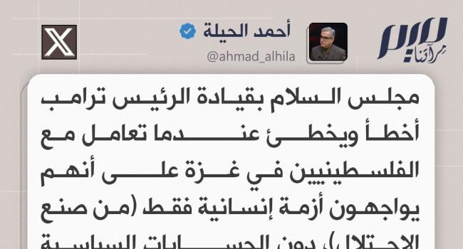أحمد الحيلة: مجلس السلام بقيادة الرئيس ترامب أخطأ ويخطئ عندما تعامل مع الفلسطينيين في غزة على أنهم يواجهون أزمة إنسانية فقط، دون الحسابات السياسية التي تعني حق تقرير المصير وزوال الاحتلال.