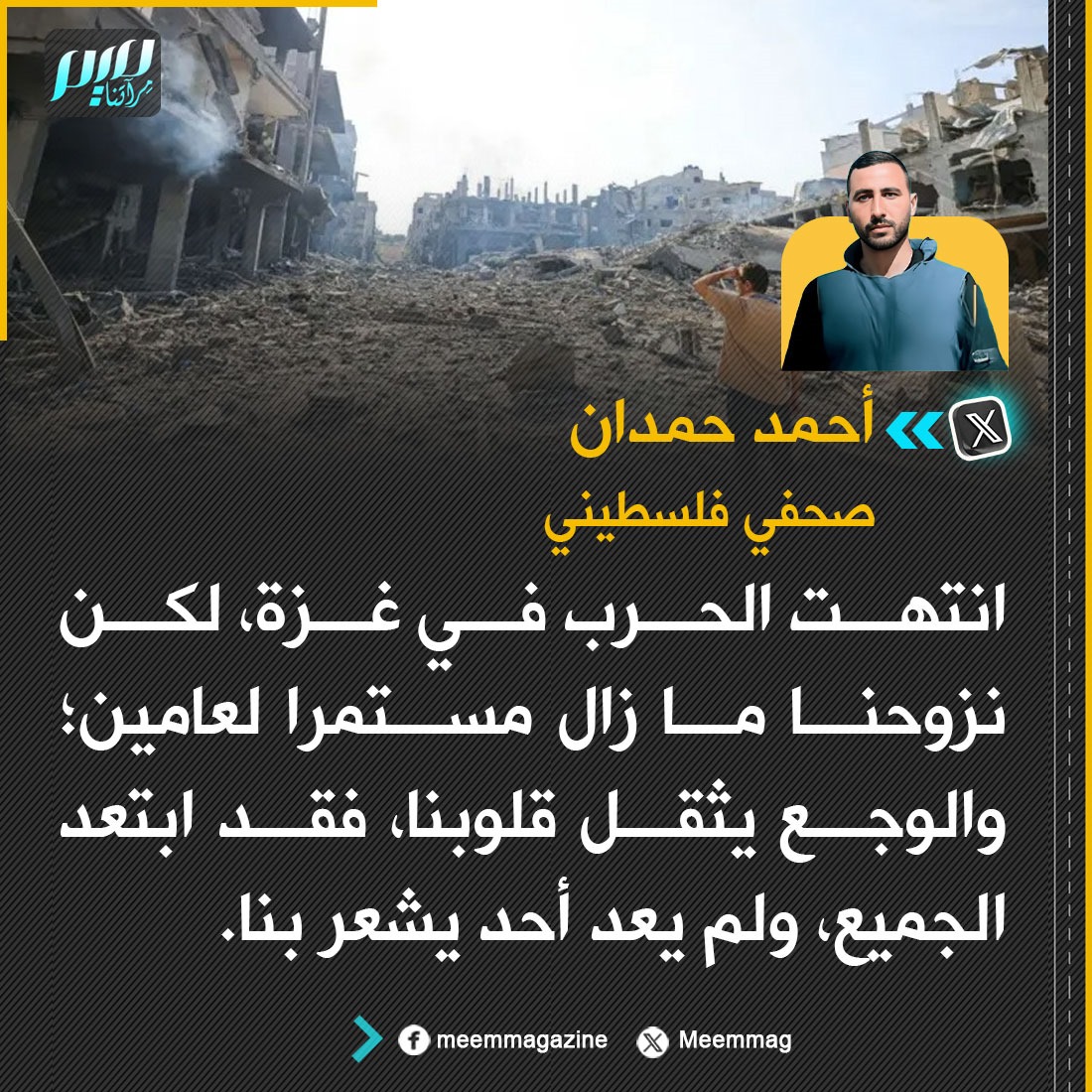 أحمد حمدان: انتهت الحرب في غزة، لكن نزوحنا ما زال مستمرا لعامين؛ والوجع يثقل قلوبنا، فقد ابتعد الجميع، ولم يعد أحد يشعر بنا.