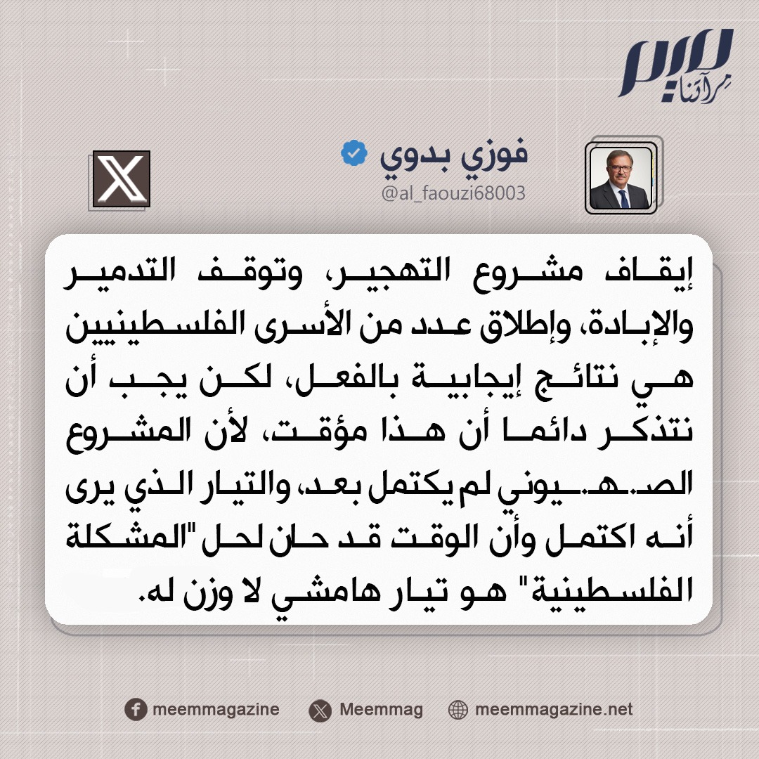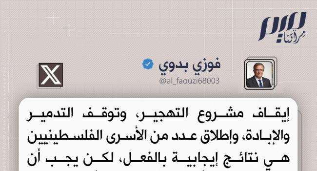 أستاذ الدراسات اليهودية فوزي بدوي: إيقاف مشروع التهجير، وتوقف التدمير والإبادة، وإطلاق عدد من الأسرى الفلسطينيين هي نتائج إيجابية بالفعل، لكن يجب أن نتذكر دائمًا أن هذا مؤقت.