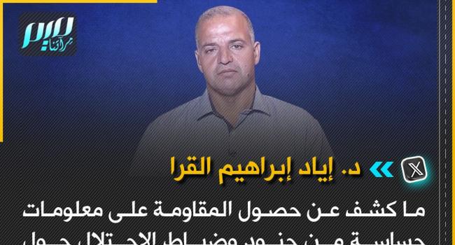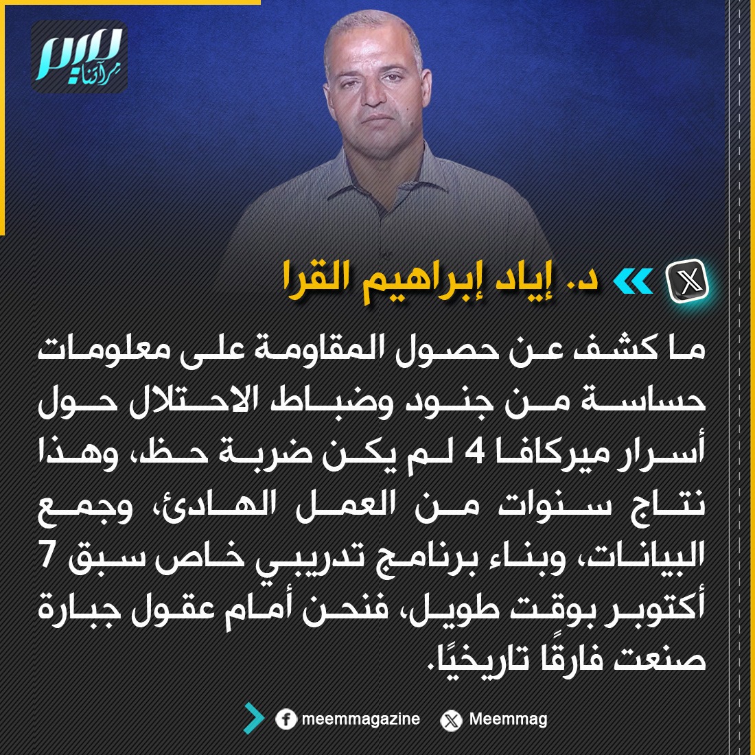 أكاديمي غزي: ما كشف عن حصول المقاومة على معلومات حساسة من جنود وضباط الاحتلال حول أسرار ميركافا 4 لم يكن ضربة حظ، وهذا نتاج سنوات من العمل الهادئ، وجمع البيانات، وبناء برنامج تدريبي خاص سبق 7 أكتوبر بوقت طويل، فنحن أمام عقول جبارة صنعت فارقًا تاريخيًا.