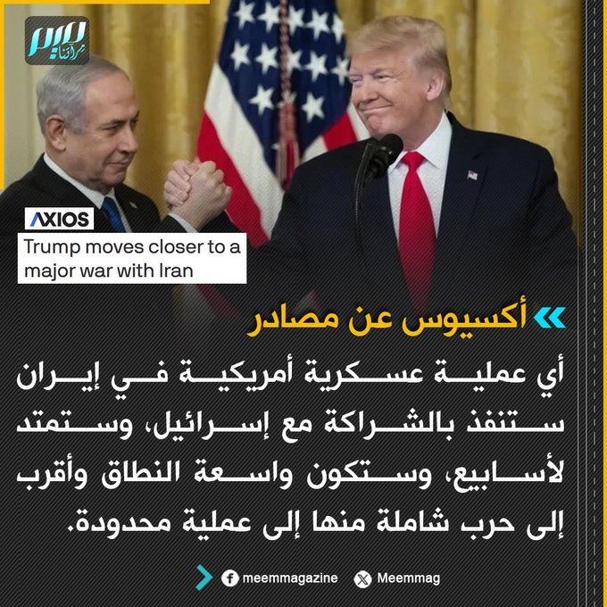 أكسيوس عن مصادر: أي عملية عسكرية أمريكية في إيران ستنفذ بالشراكة مع إسرائيل، وستمتد لأسابيع، وستكون واسعة النطاق وأقرب إلى حرب شاملة منها إلى عملية محدودة.