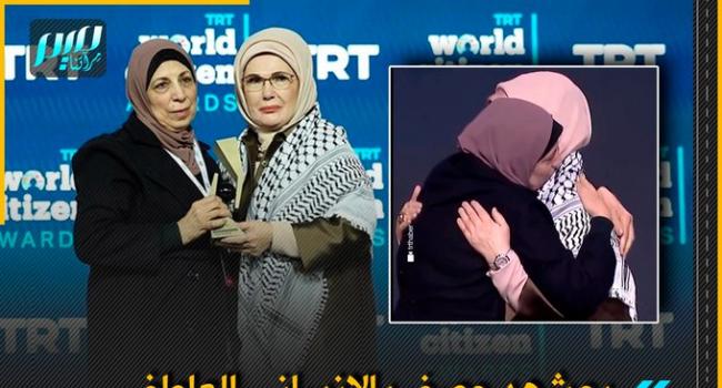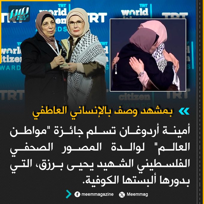 أمينة أردوغان تسلم جائزة "مواطن العالم" لوالدة المصور الصحفي الفلسطيني الشهيد يحيى برزق، التي بدورها ألبستها الكوفية