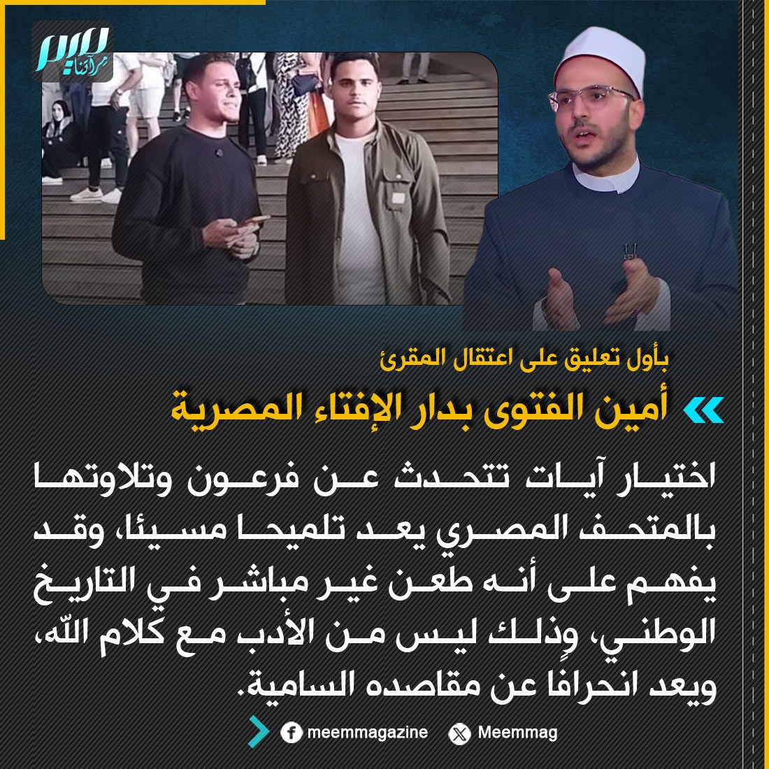 أمين الفتوى: اختيار آيات تتحدث عن فرعون وتلاوتها بالمتحف المصري يعد تلميحا مسيئا، وقد يفهم على أنه طعن غير مباشر في التاريخ الوطني، وذلك ليس من الأدب مع كلام الله، ويعد انحرافًا عن مقاصده السامية.