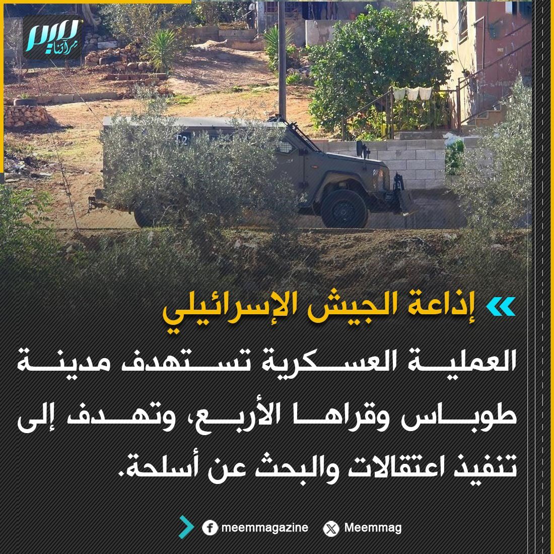 إذاعة الجيش الإسرائيلي: العملية العسكرية تستهدف مدينة طوباس وقراها الأربع، وتهدف إلى تنفيذ اعتقالات والبحث عن أسلحة.