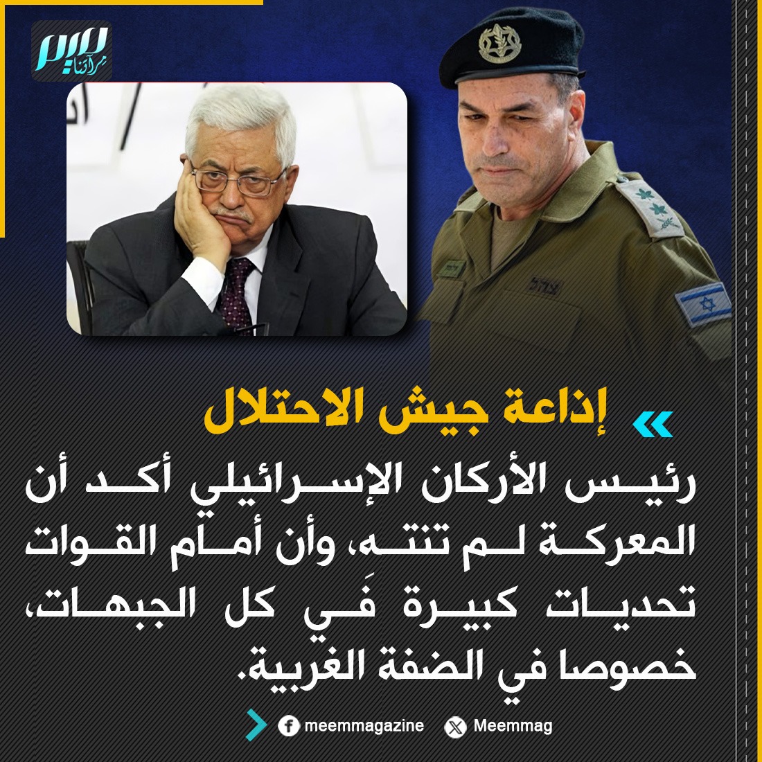 إذاعة جيش الاحتلال: رئيس الأركان الإسرائيلي أكد أن المعركة لم تنتهِ، وأن أمام القوات تحديات كبيرة في كل الجبهات، خصوصا في الضفة الغربية.